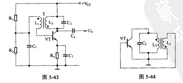 變壓器耦合振蕩器工作原理可用圖5-44說明:L2與C2組成的LC并聯(lián)諧振回路作為晶體管VT的集電極負載,VT的集電極輸出電壓通過變壓器T的振蕩線圈L2耦合至反饋線圈L1,從而又反饋至VT基極作為輸入電壓。由于晶體管VT的集電極電壓與基極電壓相位相反,所以變壓器T的兩個線圈L1與L2的同名端接法應(yīng)相反,使變壓器T同時起到倒相作用,將集電極輸出電壓倒相后反饋給基極,實現(xiàn)了形成振蕩所必須的正反饋。因為并聯(lián)諧振回路在諧振時阻抗最大,且為純電路,所以只有諧振頻率fo能夠滿足相位條件而形成振蕩,這就是LC回路的選頻作用。