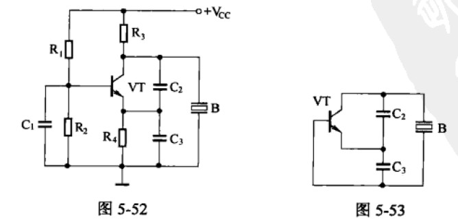 1.并聯晶體振蕩器電路如圖5-52所示,晶體B作為反饋元件,并聯于晶體管VT的集電極與基極之間。R1、R2為晶體管VT的基極偏置電阻,R3為集電極電阻,R4為發射極電阻。C1為基極旁路電容。