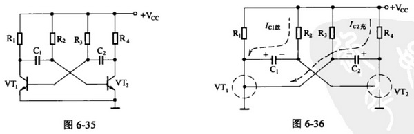 振蕩器電路圖如圖6-35所示,它也是由VT1、VT2兩個晶體管交叉耦合而成,但與雙穩(wěn)態(tài)電路或單穩(wěn)態(tài)電路不同的是,兩個晶體管的集電極-基極間的耦合均為電容耦合,見圖6-35中的C1和C2。R1、R4分別是兩晶體管的集電極電阻,R2、R3分別是兩晶體管的基極偏置電阻。