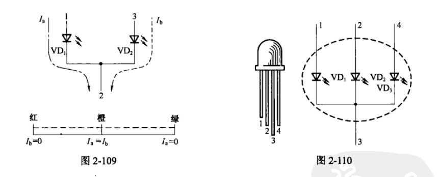2、三引腳變色LED。它是將兩種發光顏色(通常為紅色和綠色)的發光二極管管芯負極聯系在一起作為公共負極,令兩引腳分別為紅色和綠色管芯的正極。電流Ia通過管芯VD1使其發紅光,電流Ib通過管芯VD2使其發綠光,電流Ia=Ib并同時通過管芯時LED發橙色光,當Ia與Ib的比例不同時,LED發光顏色按比例在紅-橙-綠間變化,如圖2-109所示。