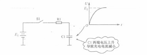 如圖5-5所示是電容兩端電壓不能突變的特性示意圖。E1是直流電源,S1是開關,R1是電阻,C1是電容,這是一個直流電源對電容C1充電的電路。