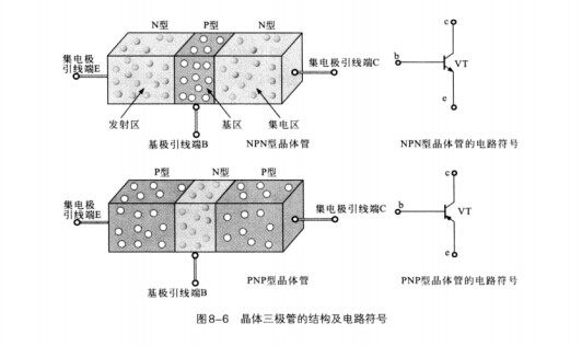 在電路圖中,晶體三極管用"VT"、"Q"等符號表示。不同類型的晶體三極管雖然制造方法不同,但在結構上都分成PNP或NPN三層。因此又將晶體三極管分為NPN型和PNP型兩種。國產硅晶體三極管主要是NPN型(3D系列),鍺管主要是PNP型(3A系列)。晶體三極管相應的結構示意圖及電路中的符號如圖8-6所示。